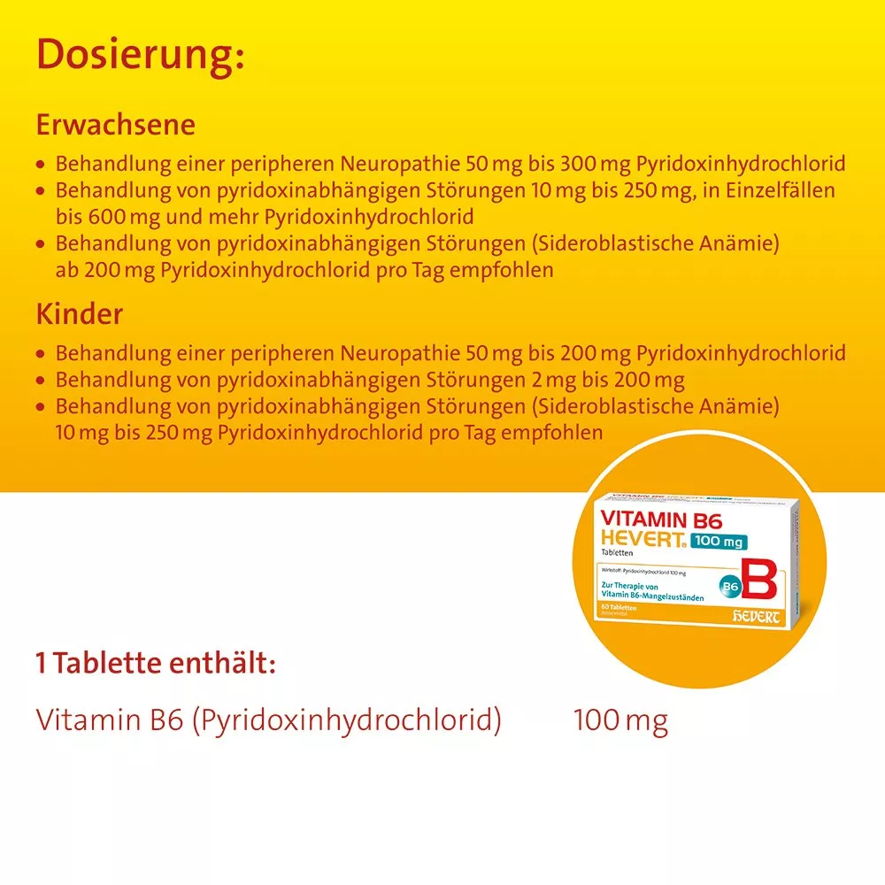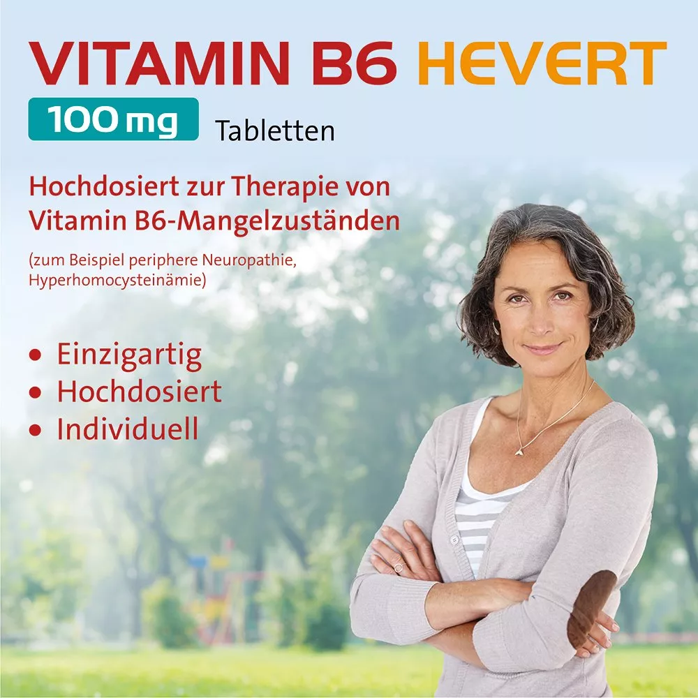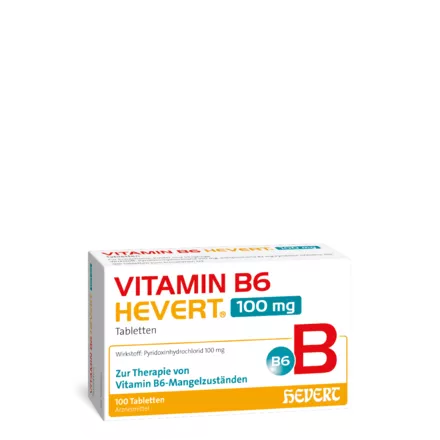 Vitamin B6 Hevert is intended to prevent or overcome a deficiency if there is an increased need for vitamin B6 or a pyridoxine-dependent metabolic disorder. If enough vitamin B6 is available, the essential cell components are provided, metabolism is activated, energy stocks are replenished, and blood formation, the nervous system and the immune system are boosted. In this way, vitamin B6 promotes the healthy development and regeneration of the body. The high-dose vitamin preparation is intended to rectify disorders in the nervous system, thus normalizing communication between nerves, cells, tissues, and organs.