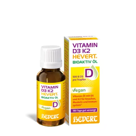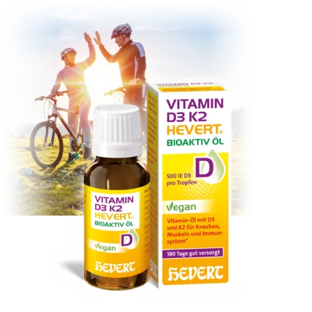 Vitamin D3 K2 Hevert Bioactive Oil combines two vital vitamins that complement each other in their effect. Vitamin D supports normal bone and muscle function and strengthens the immune system. Vitamin K activates coagulation factors and supports blood clotting. Its role in the health of blood vessels, which are often damaged by arteriosclerosis, is the subject of research. Just like vitamin D, vitamin K also contributes to bone stability. Vitamin D and vitamin K complement each other perfectly in their function. Vitamin D promotes the absorption of calcium from food and regulates the calcium level in the blood, while vitamin K ensures that the absorbed calcium reaches the right places in the body, especially bones and teeth, and is not deposited in the tissue.
