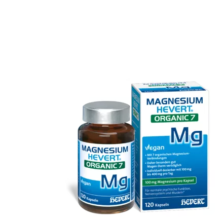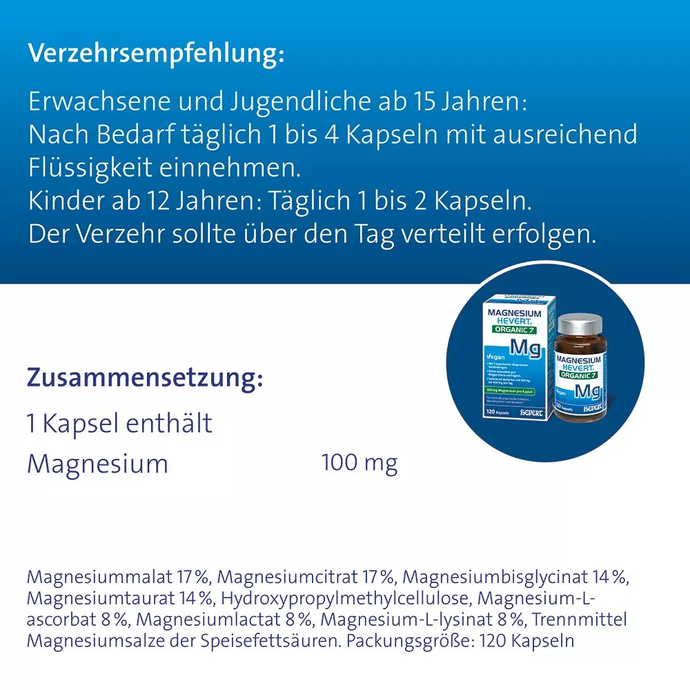 Magnesio Hevert Organic 7 – Complemento alimenticio. No recomendado para niños menores de 12 años. Cantidades superiores a 250 mg de magnesio pueden tener un efecto laxante en personas sensibles. Ingredientes: malato de magnesio 17 %, citrato de magnesio 17 %, bisglicinato de magnesio 14 %, taurato de magnesio 14 %, hidroxipropilmetilcelulosa, L-ascorbato de magnesio 8 %, lactato de magnesio 8 %, L-lisina de magnesio 8 %, antiaglomerante sales de magnesio de ácidos grasos. Tamaño del envase: 120 cápsulas.