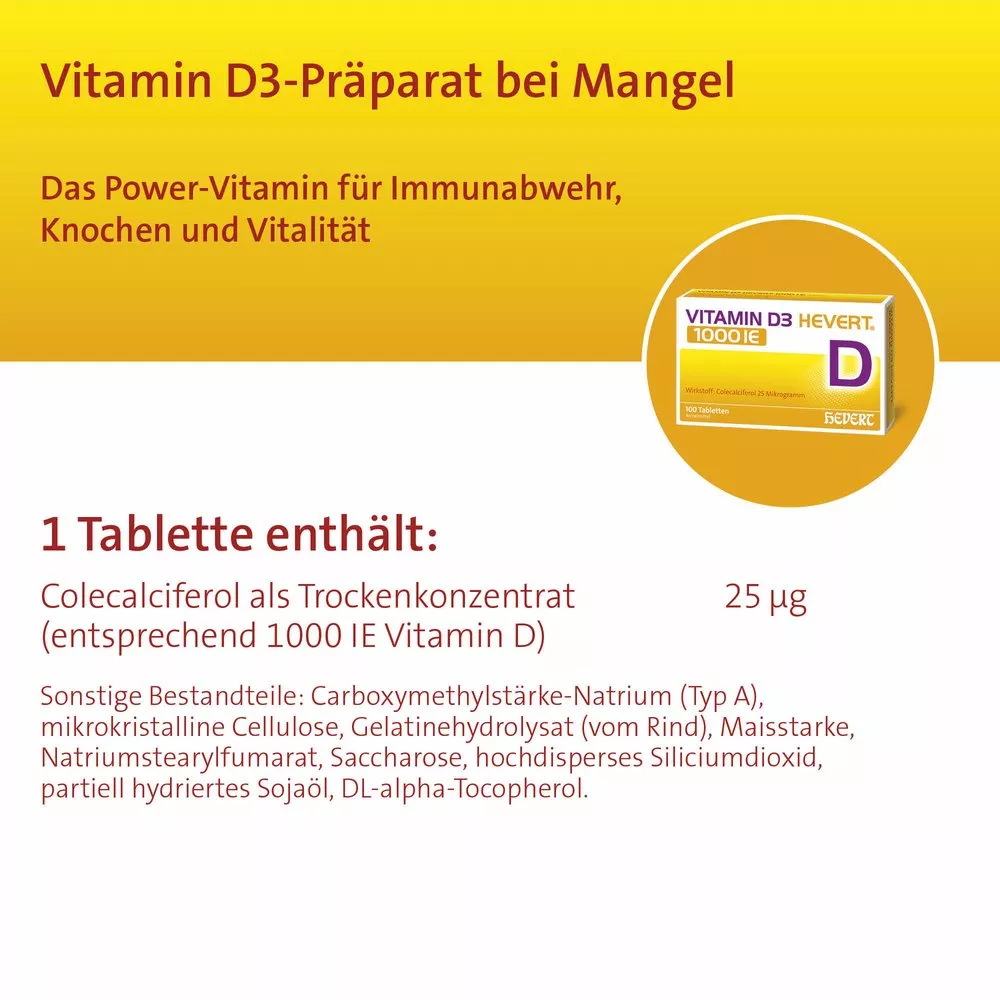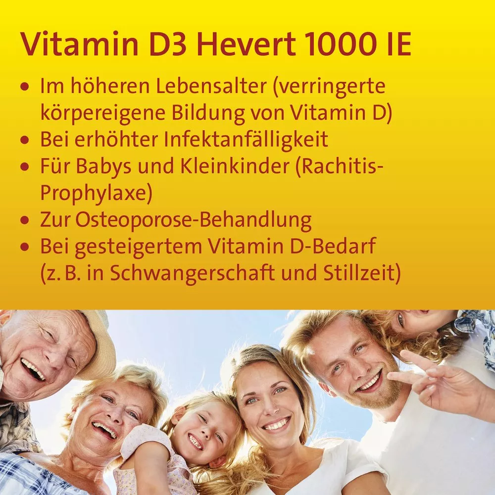 Vitamina D3 Hevert (1000 UI) Indicaciones: Para la prevención de un riesgo reconocible de deficiencia de vitamina D en personas por lo demás sanas sin trastornos de absorción, para el tratamiento de apoyo de la osteoporosis, para la prevención del raquitismo, también en bebés prematuros. Para conocer los riesgos y efectos secundarios, lea el prospecto y consulte a su médico o farmacéutico.