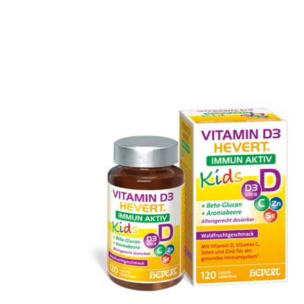 Vitamin D3 Hevert Immun Aktiv Kids está especialmente formulado para niños a partir de 4 años. El suplemento contiene vitamina D, vitamina C, selenio y zinc en cantidades que cubren una parte importante de las necesidades diarias. Así, su hijo recibe un apoyo eficaz y una combinación óptima de nutrientes esenciales para fortalecer el sistema inmunológico.