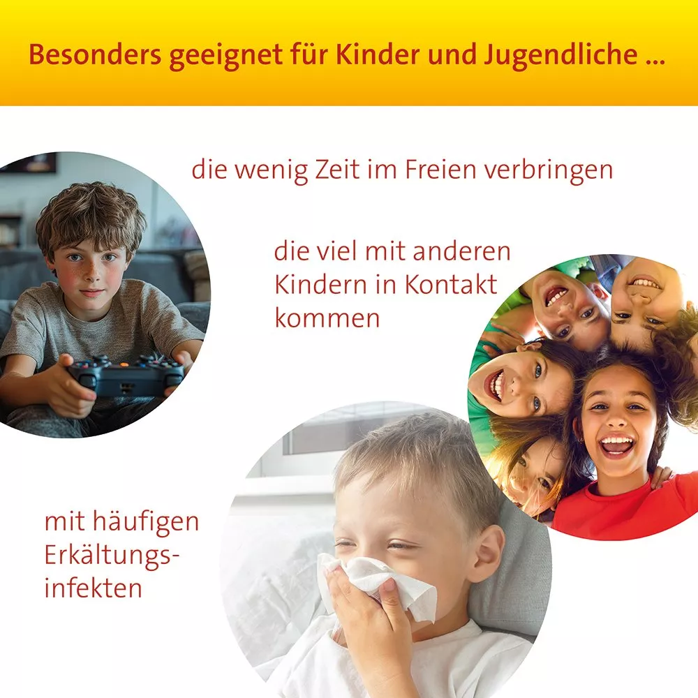 Ya sea en la guardería, en la escuela o haciendo deporte, el sistema inmunológico de los niños está en constante actividad todos los días. Si el sistema inmunológico se debilita, normalmente toda la familia se enferma. Con Vitamina D3 Hevert Immun Aktiv Kids puede reforzar las defensas de su hijo de forma duradera con importantes sustancias vitales. Es ideal para niños que reciben poco sol o se enferman con frecuencia.