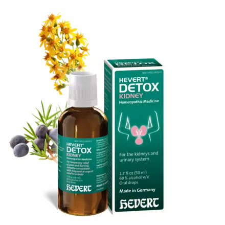 Hevert Detox Kidney is intended to activate the body’s self-healing power and help the body to overcome the bladder inflammation or urinary tract infection. The naturopathic medicine has a diuretic effect, flushing pathogens from the body. At the same time, it fights the inflammation of the bladder and urinary tract, and the burning pain associated with voiding of the bladder. The bladder muscles are relaxed, and spasmodic pain subsides. Hevert Detox Kidney may also be used to provide support alongside any necessary antibiotic treatment, in order to improve therapeutic success or shorten the duration of treatment.